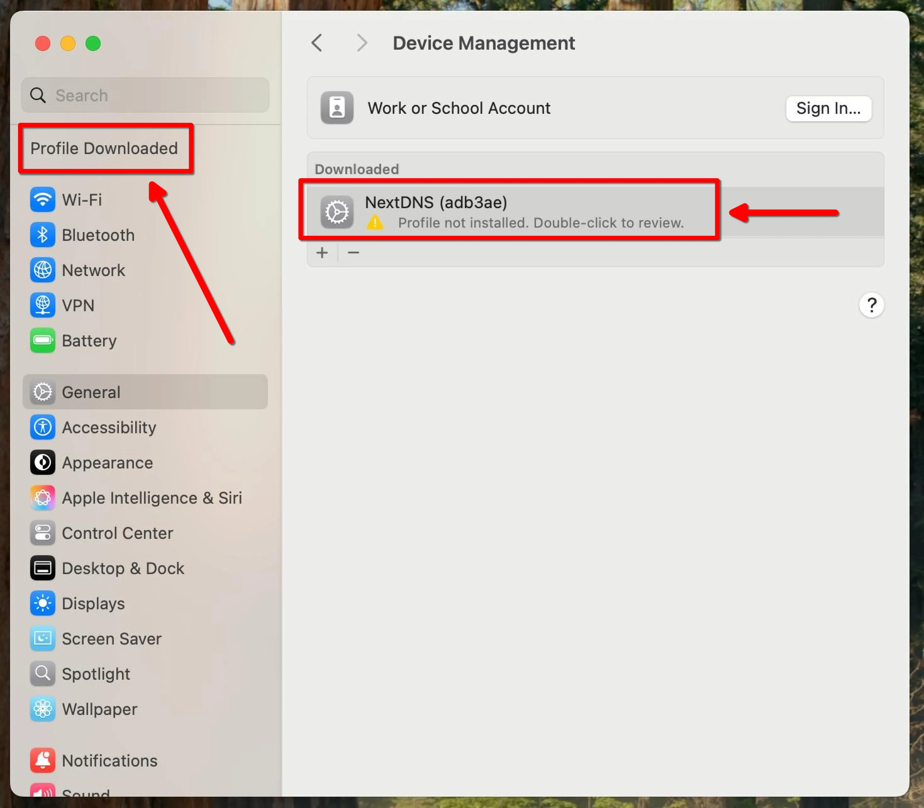 In the System Settings app, click Profile Downloaded near the top of the left sidebar, then double-click the profile you want to install